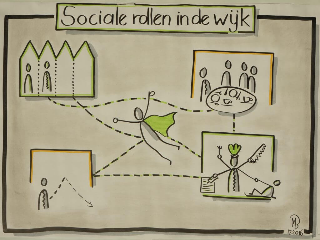 Uit de individuele interviews kwamen ook andere sociale rollen naar voren, zoals de rol van buurman of buurvrouw en de rol van informeel maatje (zie afbeelding). Deze sociale rollen ontstonden buiten de bewonersgroepen om, maar hadden soms wel een relatie met de bewonersgroepen. Informele maatjes vervulden een brugfunctie tussen individuele wijkbewoners en activiteiten van bewonersgroepen. Sommige bewonersgroepen organiseerden activiteiten die ontmoetingen tussen buren stimuleerden.