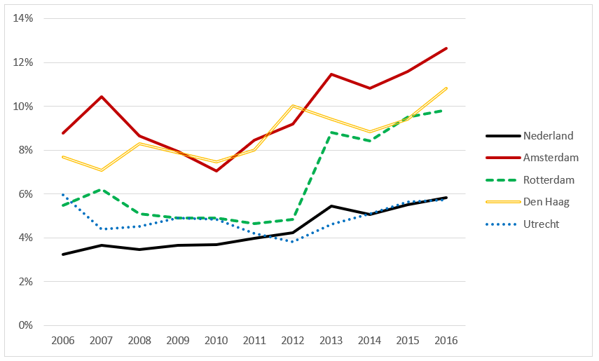 Figuur 1. Aankoop voor verhuur door particulieren met drie tot vijftig woningen als aandeel van het totaalaantal transacties in de vier grote steden en Nederland gemiddeld. Bron: Kadaster, eigen bewerking. Data voor 2016 tot en met het derde kwartaal.