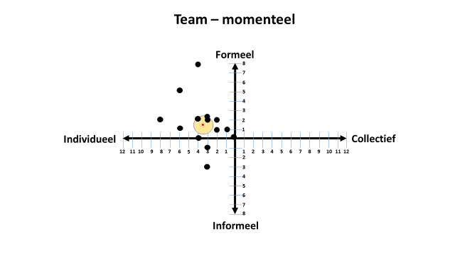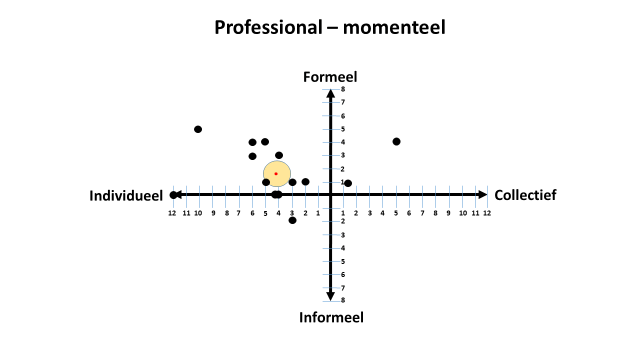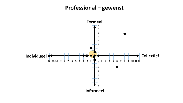 Als de scores van de respondentengroep worden gemiddeld, dan blijkt dat sociaal werkers zichzelf in het kwadrant linksboven plaatsen. Zij geven aan dat ze hulpvragen eerder individueel beantwoorden dan dat ze deze bundelen en vervolgens ook niet met een collectief aanbod komen. Ook is hun individuele aanbod iets vaker formeel dan informeel van aard. Deze conclusie geldt voor zowel de afzonderlijke professional als voor het hele team, volgens de respondenten.