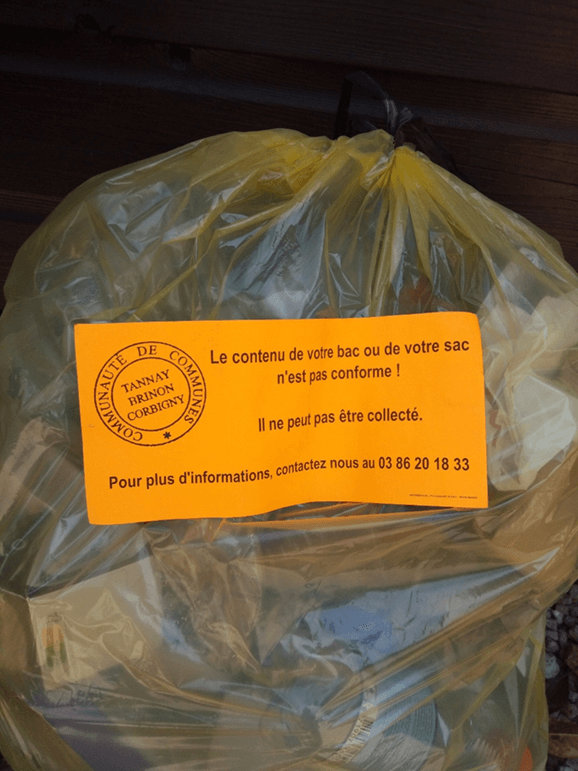 Afbeelding van een plastic zak met afval, voorzien van een gele sticker met daarop het logo van een kleine Franse gemeente en de tekst in het Frans dat de inhoud van deze zak niet conform is en de zak dus niet kan worden opgehaald. Er staat een telefoonnummer waarmee je kunt bellen.