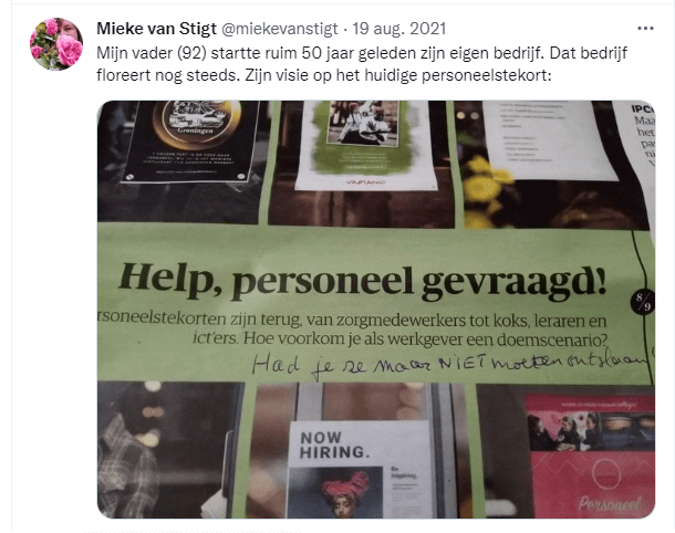 Kortom, werkgevers zouden ook eens de hand in eigen boezem kunnen steken. Zo komen 55-plussers en arbeidsbeperkten nog steeds nauwelijks aan de bak. Mijn vader is zelf decennialang werkgever geweest, en was goed voor ‘zijn’ personeel. In slechte tijden betaalde hij eerst salarissen uit en keek dan wat er voor hem en ons overbleef. Hij heeft dan ook een eigen visie op het personeelstekort, zoals blijkt uit mijn bericht op Twitter, twee jaar geleden: