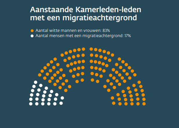 Uit de telling komt duidelijk naar voren dat de kandidaat-leden nog steeds voor het merendeel man, wit en hoogopgeleid zijn. Momenteel is ongeveer een derde van het aantal Kamerleden vrouw (47). Dat zal in de nieuwe Kamer niet veel anders zijn. Het aantal burgers met een migratieachtergrond zal wel sterk toenemen: van 10% nu (15 leden) naar 17% straks. Ook kandidaten uit een gezin waarvan een van de ouders een migratieachtergrond heeft, tellen we daarbij mee. Denk daarbij bijvoorbeeld aan Jesse Klaver (GroenLinks) en Vera Bergkamp (D66).