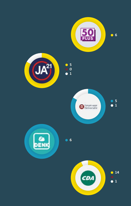 Om dat in te schatten, keken we op basis van de peilingen van half februari naar de kandidatenlijsten van de politieke partijen. We trokken de achtergronden na van de eerste 40 kandidaten van de VVD, de eerste 20 van de PVV, de eerste 15 kandidaten van CDA, PvdA, GroenLinks, D66, SP. Verder namen we de eerste 6 kandidaten van SGP, ChristenUnie, Forum voor Democratie, Denk, JA21, PvdD, 50PLUS (totaal 177) onder de loep. Behalve wellicht de VVD, hebben we zo alle partijen ruim bemeten.