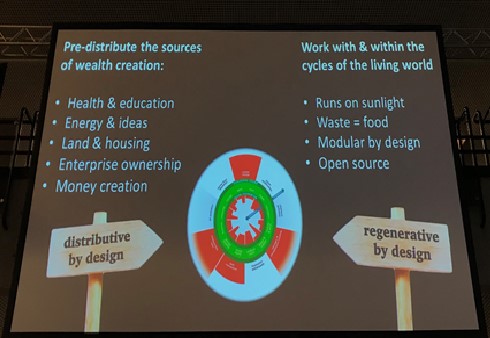 Een andere veronderstelling waar ze mee afrekent is dat de ‘markt’ vanzelf zal zorgen voor een economische ontwikkeling die rekening houdt met de ecologische grenzen. Wat nodig is voor onze overleving op aarde is een circulaire economie waarin grondstoffen telkens weer worden hergebruikt. Ook dit komt er volgens Raworth niet ‘vanzelf’ maar vraagt om ‘design’.