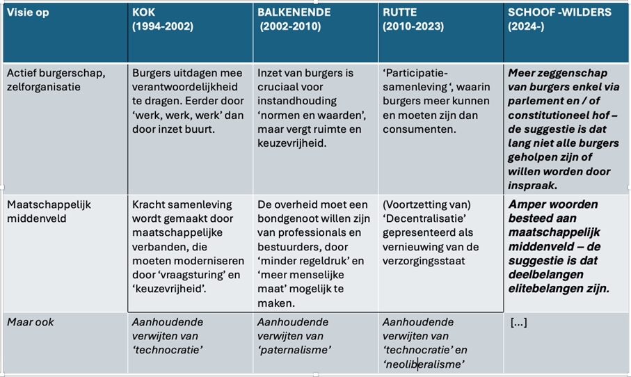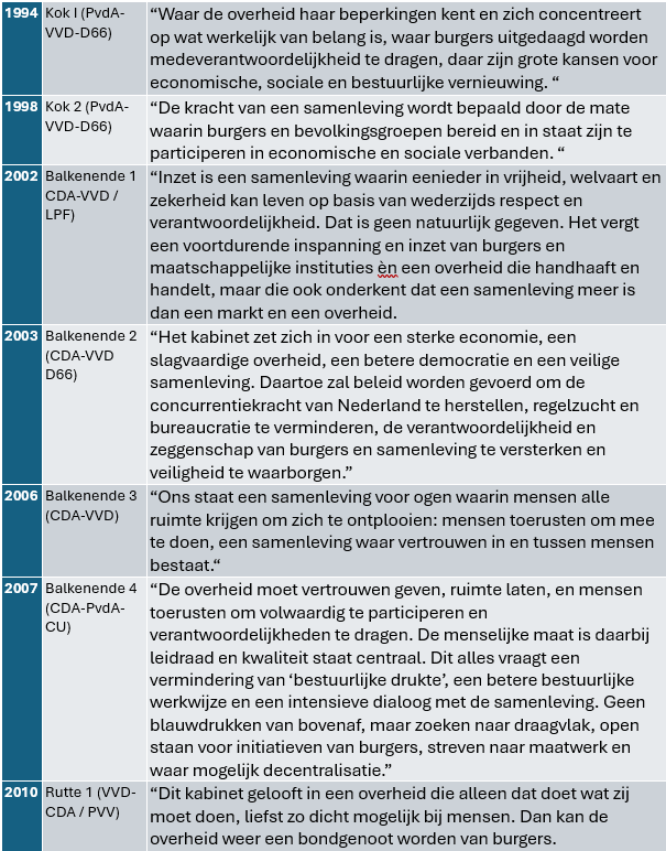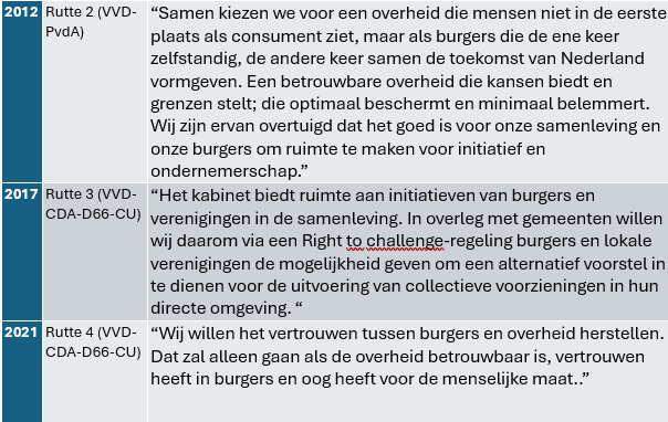 Wie daar nog het hoofd over wil breken, kan eventueel gebruikmaken van de bijgaande overzichten, samengesteld voor mijn recente lezingen voor onder meer de gemeente Amsterdam en het ministerie van Binnenlandse Zaken en Koninkrijksrelaties. Er is te zien wat de voorgaande regeringen zeiden over burgers en middenveld, opdat het contrast helder wordt.