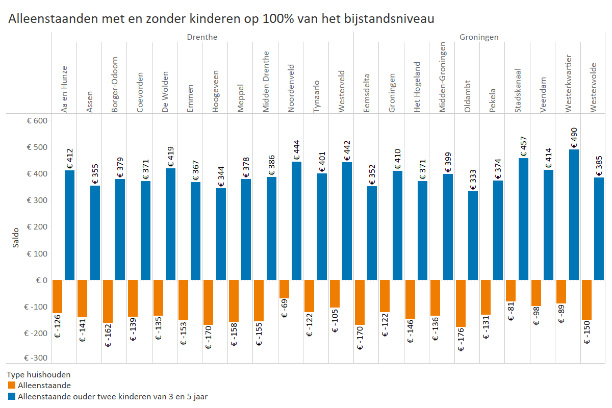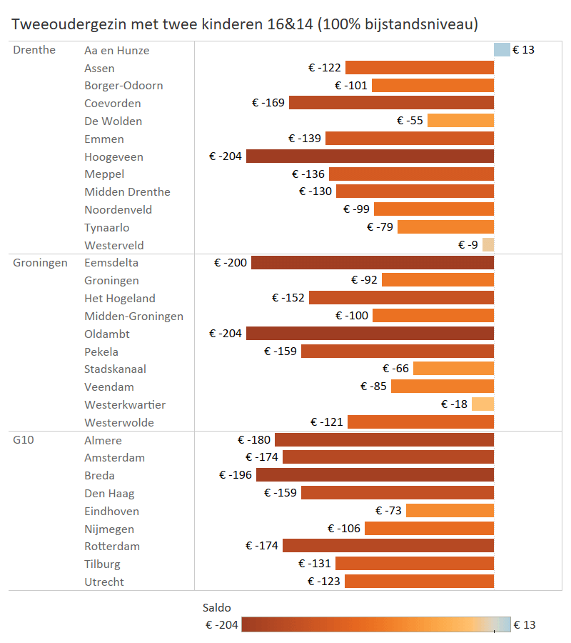 [2] Andere gemeenten in Groningen en Drenthe vertonen overigens een vergelijkbaar beeld. In gemeente Assen is het verschil tussen een alleenstaande en een alleenstaande met kinderen een kleine 500 euro. In de gemeente Groningen is dat verschil 530 euro.