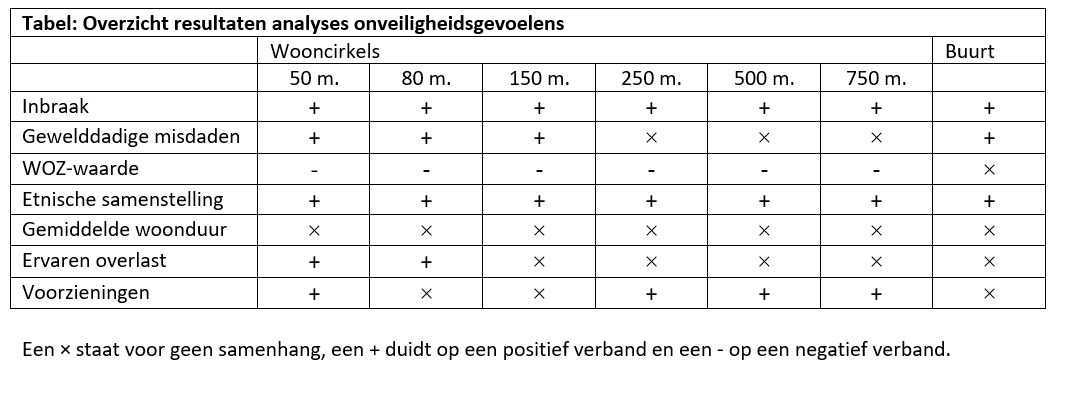 De afzonderlijke resultaten zijn samengevat in de onderstaande tabel. Voor elk onderzocht kenmerk is te zien of het wel of niet verband houdt met onveiligheidsgevoelens, en of het kenmerk samenhangt met meer (+) of minder (-) onveiligheidsgevoelens. De meest opvallende bevinding is dat het beeld varieert per onderzochte schaal (de persoonlijke cirkels en de buurt).
