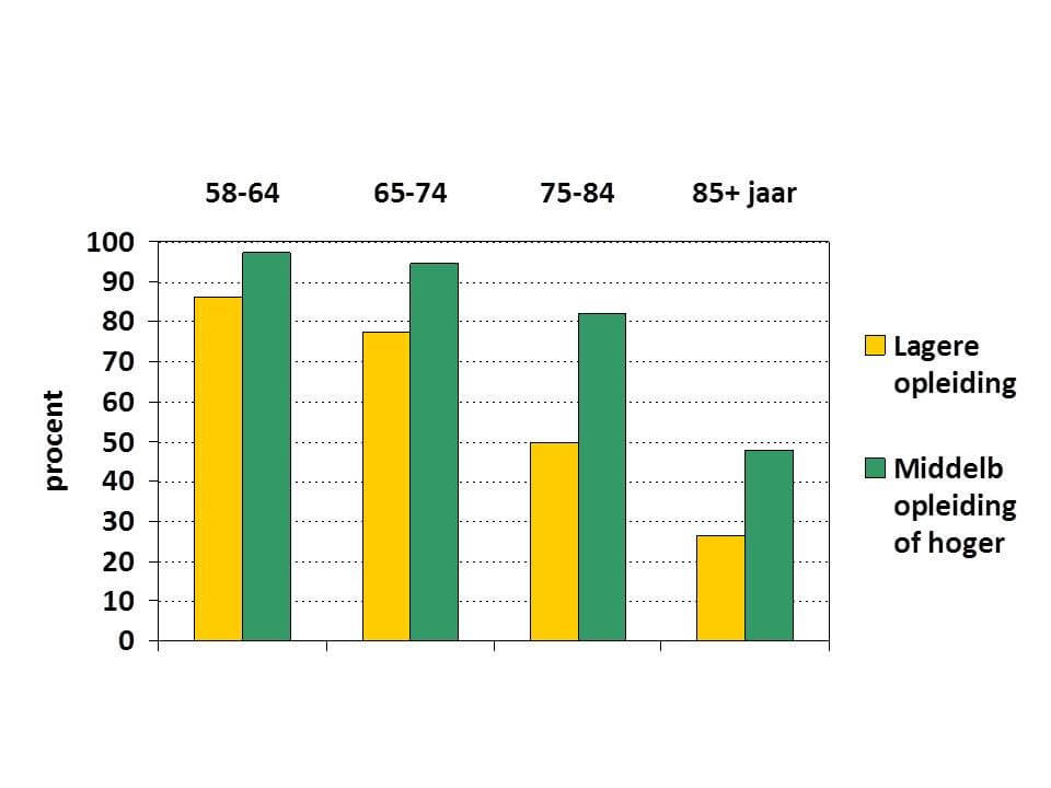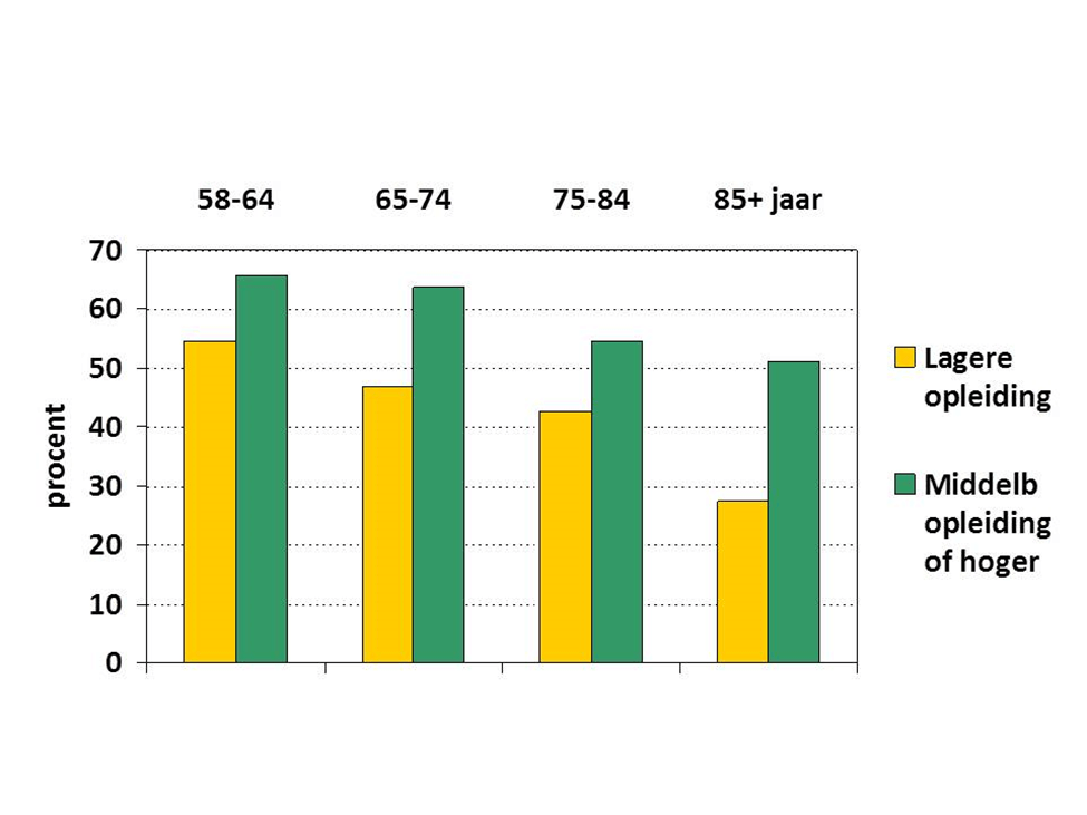 Hoger opgeleide ouderen hebben in iedere leeftijdsgroep een betere zogeheten functionele gezondheid. Alleen boven de 85 jaar zijn de verschillen zo klein dat ze niet meer statistisch betekenisvol zijn. In deze oudste leeftijdsgroep heeft minder dan één op de tien ouderen een goede functionele gezondheid.