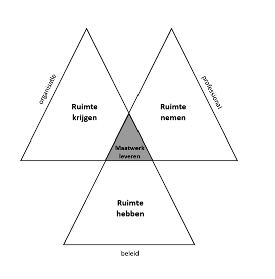 Wij ontwikkelden een (gespreks)model dat houvast biedt bij het bepalen van de ruimte voor maatwerk. Drie factoren blijken altijd van invloed: beleid, organisatie en de professional zelf. Professionals moeten beleidsruimte hebben voor maatwerk, organisatorische ruimte krijgen om deze in te zetten, en zelf de ruimte nemen om maatwerk in hun dagelijks handelen te integreren. Al deze dimensies zijn nodig voor het toepassen van maatwerk. Dit is weer te geven met drie overlappende driehoeken, elk met een eigen dimensie, waarbij de overlap de daadwerkelijke ruimte voor maatwerk weergeeft (zie figuur 1).