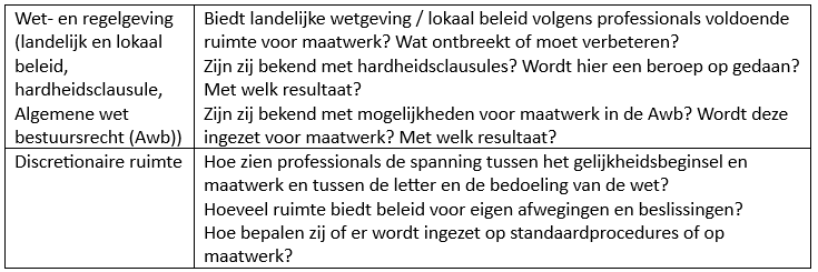 Tot slot zijn het de uitvoerend professionals zelf die gebruik moeten maken van beschikbare ruimte voor maatwerk. Hierbij kunnen zij zich baseren op hun professionele deskundigheid die bestaat uit ervaring en kennis: werkervaring in hun vakgebied en kennis van relevante wetgeving en de ruimte hierin voor maatwerk én kennis van bijzondere omstandigheden binnen individuele casussen.