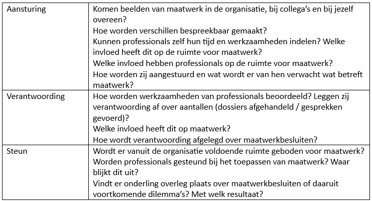 Door dat gesprek op te delen in de vragen welke ruimte de uitvoerend professional heeft, welke ruimte de professional krijgt en welke ruimte de professional neemt, kan de ruimte voor maatwerk in kaart worden gebracht. Dat lijkt ons een cruciale eerste stap voor alle betrokkenen om maatwerk uitvoerbaar te maken en te houden.