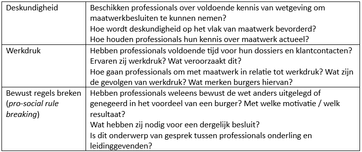 De vragen die professionals zichzelf en elkaar kunnen stellen, gaan over deskundigheid, werkdruk en het bewust overtreden van regels in het voordeel van cliënten (tabel 3).