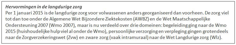 Het Nederlandse systeem van langdurige zorg voor volwassenen is begin dit jaar ingrijpend hervormd. Door de nieuwe wet- en regelgeving is er veel veranderd voor cliënten en zorgpartijen. Zo hebben de professionele zorgpartijen (zorgaanbieders, gemeenten, zorgverzekeraars, zorgkantoren en het Centrum Indicatiestelling Zorg) nieuwe taken en verantwoordelijkheden gekregen. De hervorming gaat gepaard met vermindering van het budget. De hervormingen bieden nieuwe mogelijkheden en stimulansen voor zorgpartijen om de langdurige zorg doelmatiger te organiseren, maar er kunnen ook belemmeringen en risico’s optreden. En voor de cliënt verandert er ook het een en ander.
