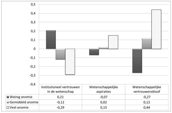 Hoe anomischer men is, zo laat de figuur zien, hoe meer men verwacht van de wetenschap. Anomische mensen hebben dus tegelijkertijd weinig institutioneel vertrouwen ten aanzien van de wetenschap én hogere wetenschappelijke aspiraties. De figuur laat voor deze categorie mensen dan ook forse verschillen zien in de vertrouwenskloof.