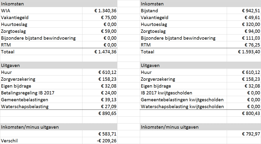 Bovendien zouden de maandelijkse uitgaven lager zijn, vanwege het feit dat de betaling inkomstenbelasting 2017, de gemeentebelasting en de waterschapsbelasting zouden worden kwijtgescholden. Als mevrouw Dekker die bijstandsuitkering zou hebben, zou ze er per maand uiteindelijk 209 euro meer aan overhouden.