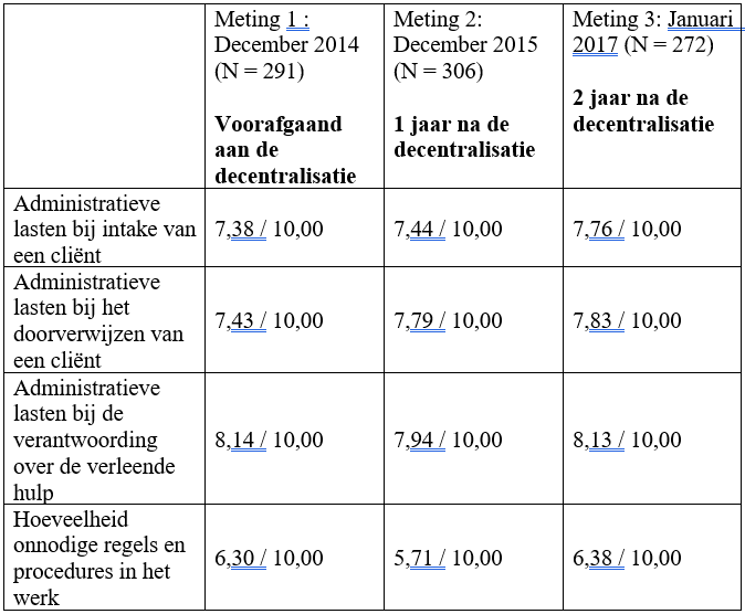 In de hoeveelheid onnodige bureaucratie is daarnaast een interessante ontwikkeling te zien. In het eerste jaar na de decentralisatie rapporteren jeugdzorgwerkers aanzienlijk minder onnodige regels en procedures, maar in het jaar daarna is de situatie weer terug bij af.