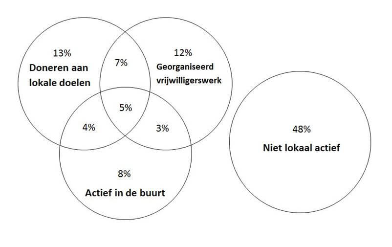 Uit ons onderzoek blijkt dat 52 procent van de Nederlanders op een of meerdere manieren lokaal participeert. Veel mensen die ongeorganiseerde activiteiten in de buurt verrichten besteden ook tijd of geven geld aan lokale organisaties. Zo besteedt drie procent van alle Nederlanders tijd aan zowel georganiseerde als ongeorganiseerde vrijwillige lokale activiteiten, terwijl vier procent zowel actief is in de buurt als geld doneert aan organisaties die lokaal actief zijn. Er is een groep van vijf procent zeer actieven die vrijwilligerswerk doen voor een organisatie, geld geven aan lokale instellingen en zelf actief zijn in de buurt. Structureel vrijwilligerswerk binnen een organisatie blijkt populairder dan actief burgerschap. Negentien procent van de bevolking is ten minste eenmaal per maand actief als vrijwilliger in organisatieverband zonder ongeorganiseerde vrijwillige activiteiten te uit te voeren, terwijl twaalf procent zich enkel bezighoudt met activiteiten voor de buurt op informele basis.