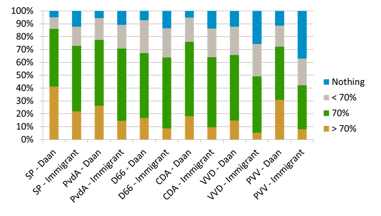 De gun-kloof tussen autochtone werklozen en werkloze migranten zien we bij kiezers van alle grote partijen. Alle groepen kiezers maken onderscheid tussen geboren Nederlanders en migranten, maar de mate waarin verschilt. De kloof tussen geboren Nederlanders en migranten is het grootst onder PVV-kiezers (30 procent verschil in het gunnen van uitkering), VVD-kiezers (16 procent verschil), en SP-kiezers (13 procent verschil). Het onderscheid tussen geboren Nederlanders en migranten is het kleinst onder D66-kiezers (3 procent verschil) en PvdA-kiezers (7 procent verschil). Overigens zouden de SP- en PvdA-kiezers – ondanks de grotere kloof met autochtone werklozen – de migrant nog altijd eerder een hoge uitkering gunnen dan de D66-kiezers doen.