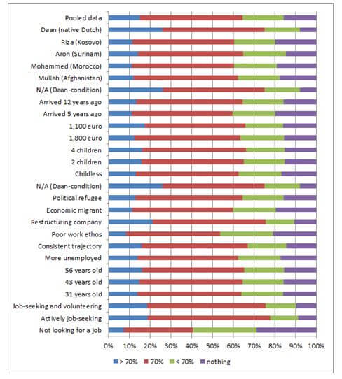 Alleen actieve inzet in het zoeken naar een nieuwe baan en verwijtbare werkloosheid zijn belangrijkere gun-factoren. Werklozen die actief naar werk zoeken, wordt door 76 procent de uitkering gegund. Als mensen niet actief naar werk zoeken, halveert dit bijna (41 procent). Als het verlies van de baan niet aan de werknemer zelf ligt, gunt wederom 75 procent de uitkering, terwijl deze steun daalt tot 54 procent wanneer de werknemer door eigen toedoen is weggestuurd. Met andere woorden: de ‘straf’ voor de Marokkaanse migrant (15 procent) is niet veel minder dan de ‘straf’ voor de werkloze die door eigen schuld is ontslagen (21 procent). Voor een Marokkaanse migrant die door eigen schuld is ontslagen, zijn de straffen goeddeels cumulatief.