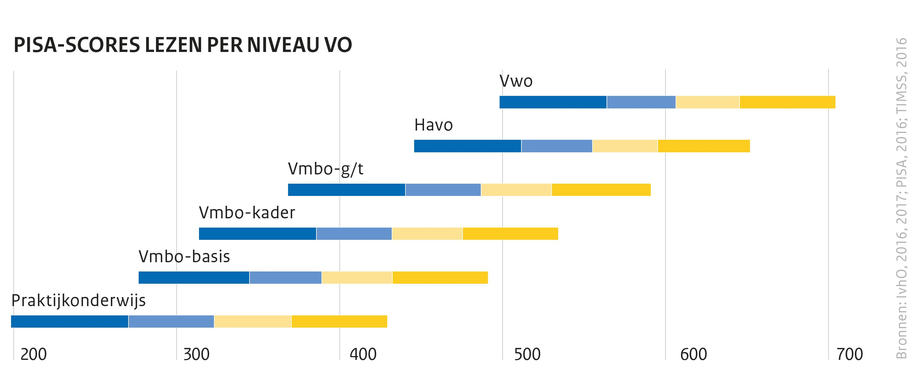 Dit gebeurt vaker. Er wordt over leerlingen gesproken als een ‘echte havo-leerling’, of een ‘echte vmbo-t leerling’. Maar wat is dat? Onderzoek toont aan dat het idee van een bepaald type leerling helemaal geen hout snijdt. Onderstaand figuur van de Onderwijsinspectie laat zien hoe 15-jarige leerlingen binnen één niveau op de middelbare school scoren op een algemene taaltoets. Wat opvalt is de enorme spreiding binnen niveaus: de beste vmbo-t-leerlingen scoren net onder het gemiddelde van het vwo. De bovenste 25 procent van de havo’ers scoort boven het vwo-gemiddelde.