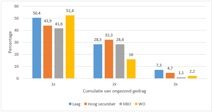 Het beeld is anders als we kijken naar de groep die drie risicovolle leefstijlgewoonten combineert. Hierin treffen we ruim zesmaal zoveel laag opgeleiden aan als hbo-opgeleiden. Onder de laagst opgeleiden komen dus vaker personen voor die meerdere risicofactoren combineren.