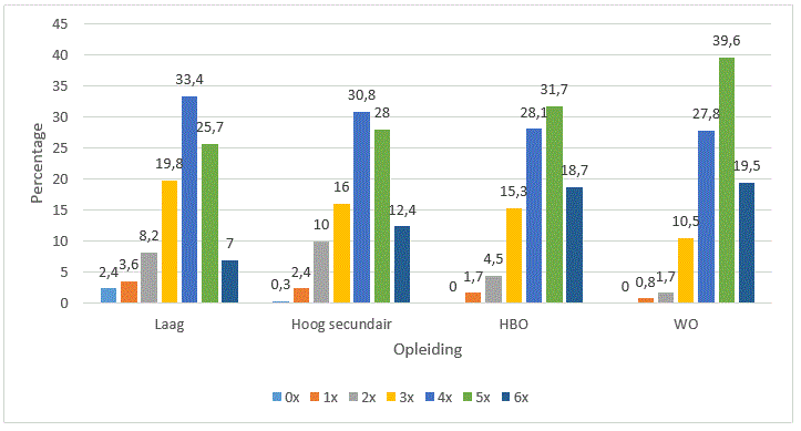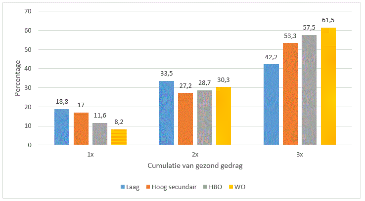 Ten slotte hebben we gezonde en ongezonde gedragingen samengenomen. In Figuur 3 is een index van gezonde leefstijlgedragingen gemaakt, waarbij de bovengenoemde ongezonde gedragingen zijn gespiegeld (dus als niet roken, niet regelmatig drinken en geen overgewicht). We zien dan dat de cumulatie van gezondheidsgedrag het meest uitgesproken is bij de hoogst opgeleiden. 59,1% van de wo-opgeleiden rapporteert vijf of meer gezonde leefstijlgedragingen. Bij de laagst opgeleide groep is dat slechts 32,7%; 2,4% van deze groep heeft zelfs geen enkele gezonde gedraging, wat bij hoogopgeleiden helemaal niet voorkomt.