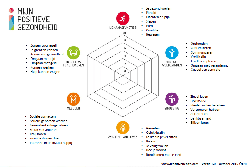 Gezondheid is volgens Huber niet een doel op zich, maar een middel om iets te bereiken en gaat ook om beleving. Ze visualiseerde dit in een spinnenweb en geoperationaliseerd in zes domeinen: lichaamsfuncties, mentaal welbevinden, zingeving, kwaliteit van leven, meedoen en dagelijks functioneren (zie figuur 1).