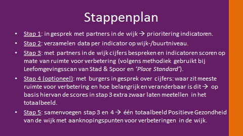Het model verzamelt fysieke, sociale en gezondheidsdata over de wijk op basis van de zes domeinen van positieve gezondheid en is nadrukkelijk bedoeld om in gesprek te gaan met professionals in de wijk en bewoners. Zij kennen de wijk het beste en weten waar ruimte voor verbetering zit en zien de mogelijkheid voor verandering. De aanpak creëert eigenaarschap, zelfregie en gemeenschapsgevoel. De burgers blijven baas in eigen buurt en zoeken met eventuele hulp en ondersteuning naar voor hen passende maatregelen.
