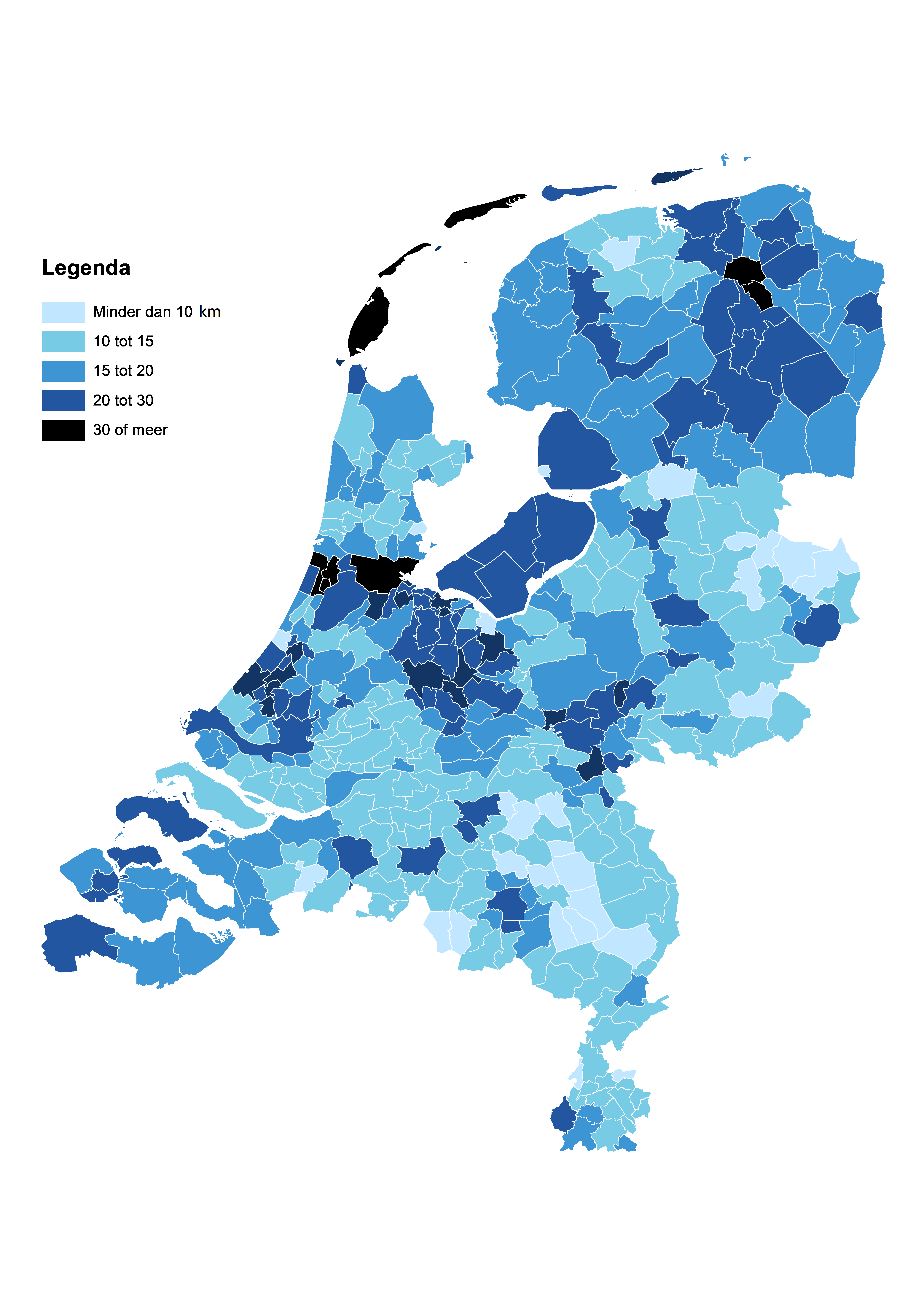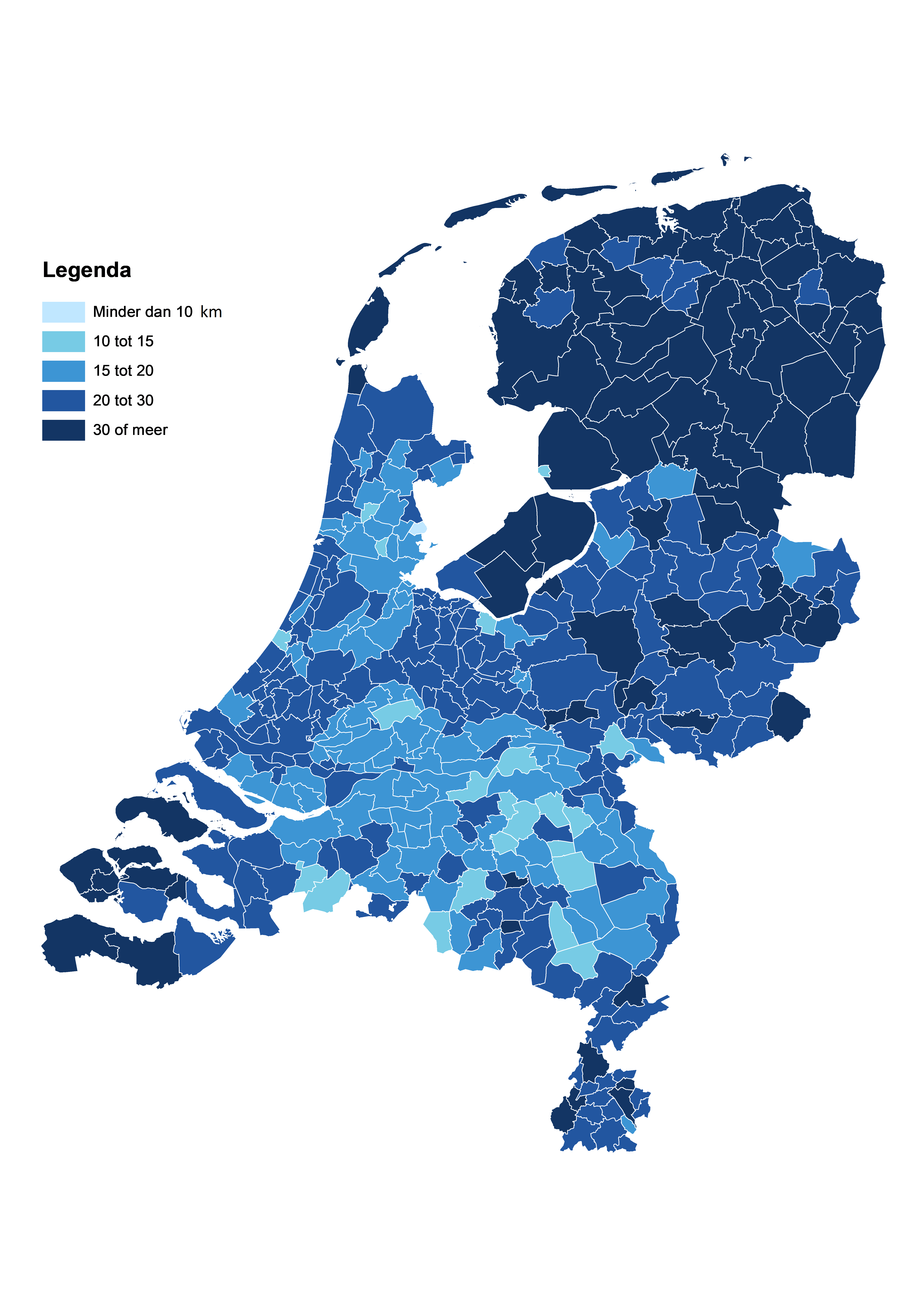 Kaart 2 biedt het omgekeerde perspectief: afstanden gezien vanuit het ‘gezichtspunt’ van de ouderen. Hier zien we dat ouderen die in landelijke gebieden wonen, dikwijls kinderen hebben die ver weg wonen. Wederom heeft dat te maken met verstedelijkingspatronen uit het verleden: het wegtrekken van (kansrijke) jongeren uit deze gebieden.
