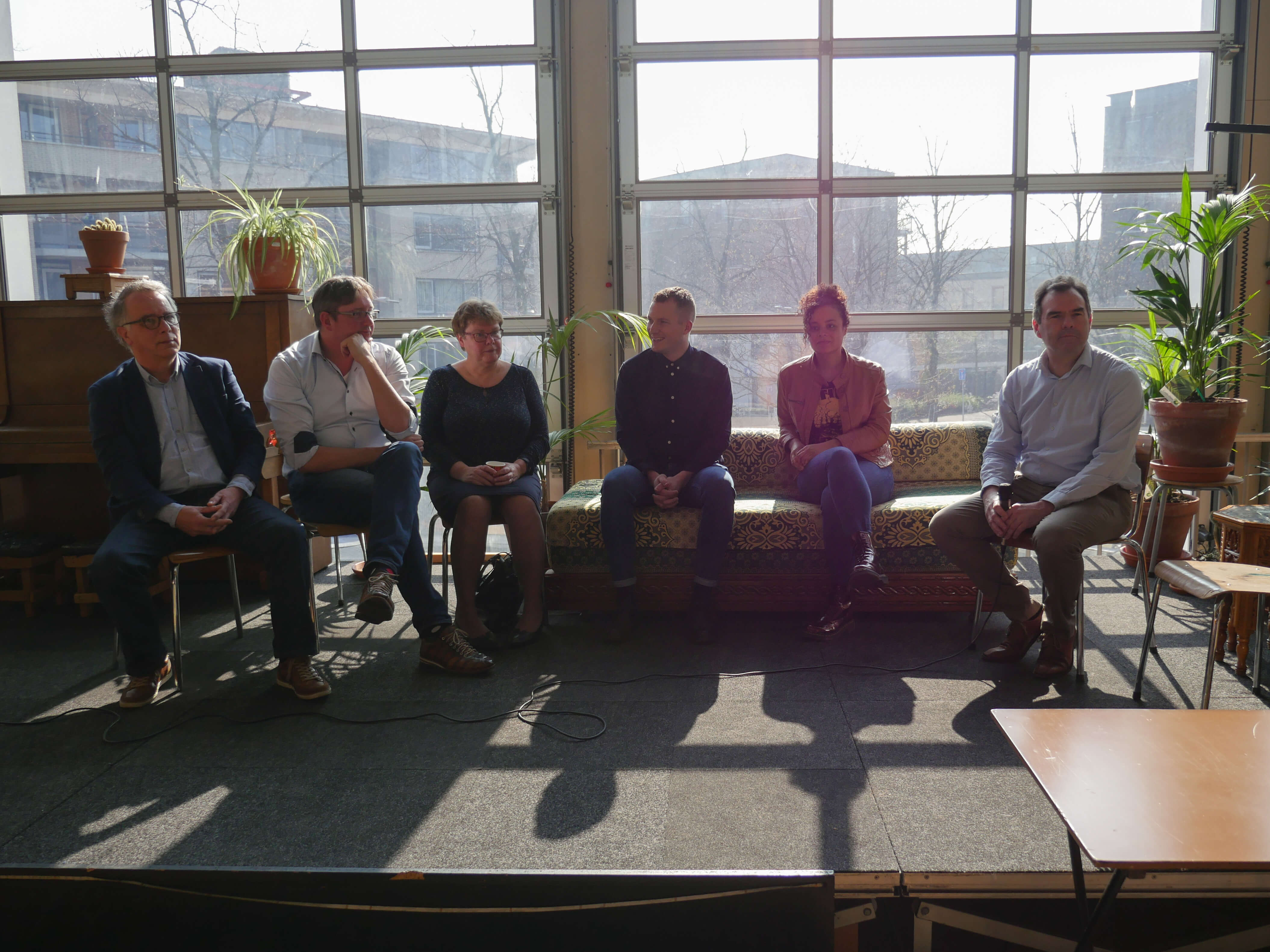 Marc Räkers, voorman van Eropaf!, doet een inleidend verhaal en gaat het gesprek aan met vijf mensen die naast Peters op het podium plaats hebben genomen.