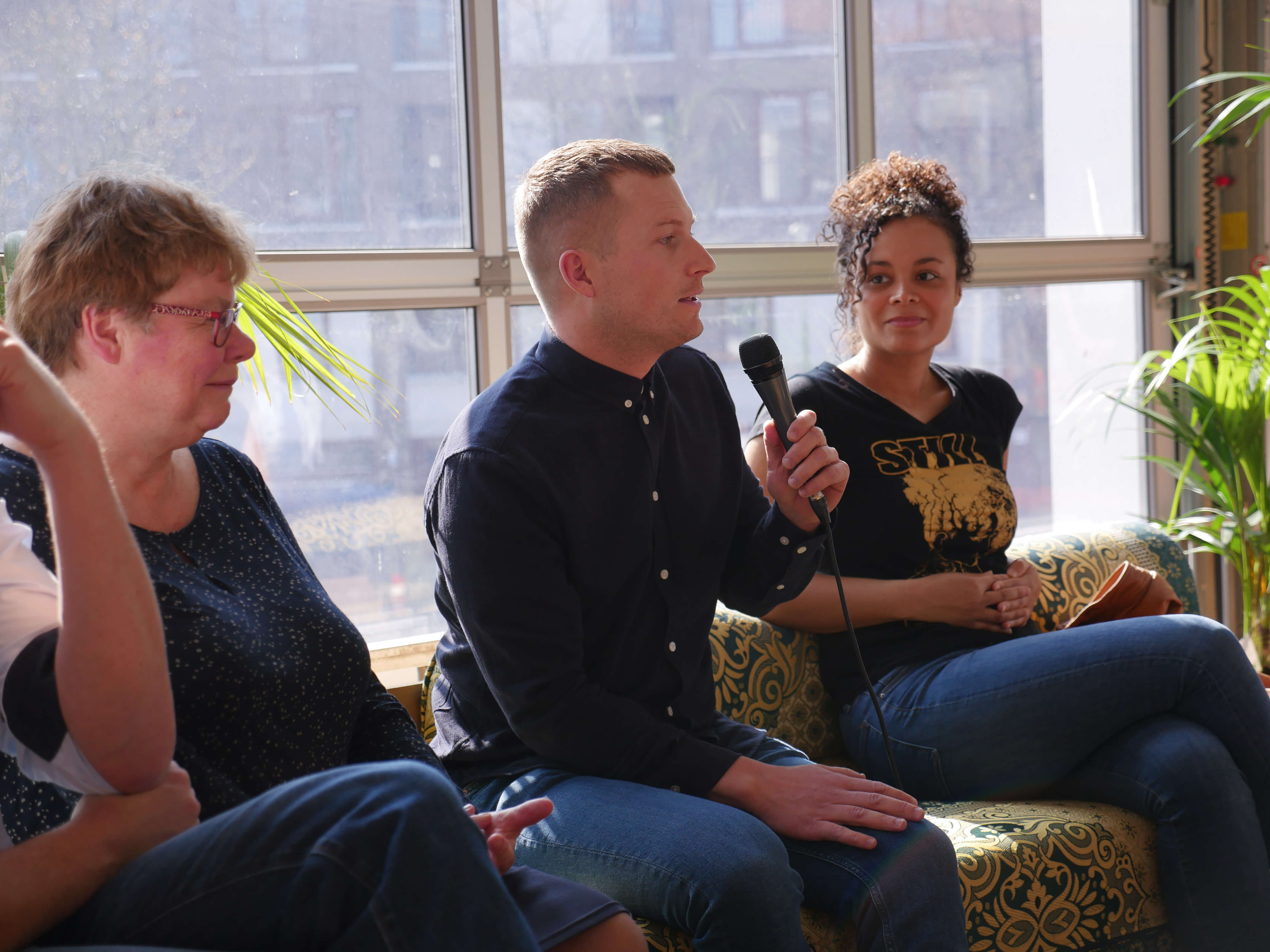 Marc Räkers, voorman van Eropaf!, doet een inleidend verhaal en gaat het gesprek aan met vijf mensen die naast Peters op het podium plaats hebben genomen.