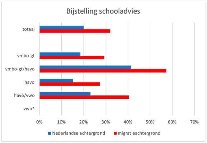 Bij het onderscheid naar migratieachtergrond valt op dat leerlingen met een migratieachtergrond een grotere kans op bijstelling van het advies hebben dan leerlingen met een Nederlandse achtergrond. Deze resultaten bevestigen wat bijstelling beoogt, namelijk een tweede kans te bieden aan leerlingen om het advies te krijgen dat past bij hun talenten.