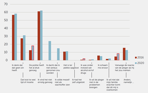 Redenen voor het niet melden van ervaringen met seksuele straatintimidatie, 2016 (N=725) en 2020 (N=1124)