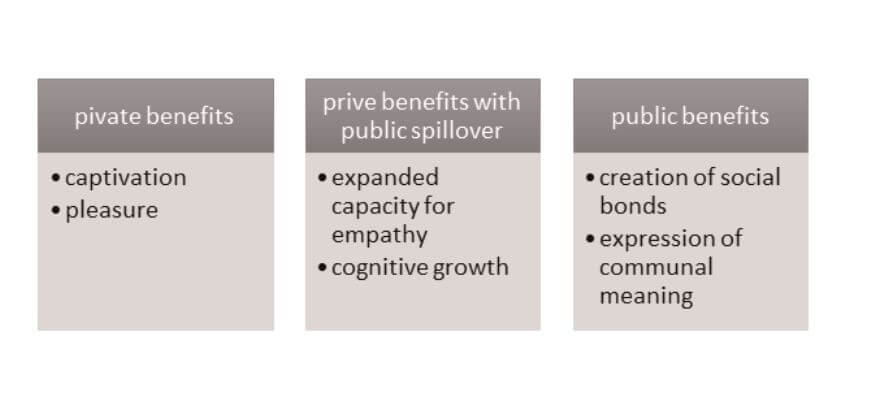 Als effect voor het individu ziet hij ‘het gegrepen worden, het beleven van diepe concentratie, dat ook wel een flow-ervaring wordt genoemd en het beleven van plezier’. De betekenis voor het individu met tegelijkertijd een effect voor het publieke domein van het deelnemen aan kunst en cultuur bestaat naar zijn idee uit de cognitieve groei van een individu en het vergrote empathisch vermogen. Als voordelen voor het publieke domein wijst hij op sociale binding en ‘expression of communal meaning’.