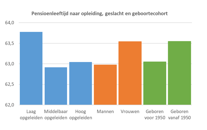 In het onderstaande staafdiagram staat de gemiddelde pensioenleeftijd weergegeven, uitgesplitst naar een drietal relevante factoren.1 Hieruit blijkt dat middelbaar en hoogopgeleiden eerder met pensioen gaan dan laagopgeleiden, respectievelijk ongeveer 10 en 8 maanden eerder. Vrouwen blijken gemiddeld genomen een half jaar langer door te werken dan mannen. Volgens de verwachting gaan jongere generaties op hogere leeftijd met pensioen dan oudere generaties.2 Het beleid van langer doorwerken lijkt op dit laatste vlak dus effectief.