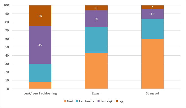 Zo’n 70 procent van de oudere werknemers in ons onderzoek die ten minste wekelijks mantelzorg verlenen, vindt dat het geven van hulp erg veel of tamelijk veel voldoening geeft (figuur 2). Een minderheid – maar wel een substantiële groep – ervaart de mantelzorg als erg of tamelijk zwaar (26 procent) of stressvol (16 procent). Van degenen die de mantelzorg zwaar vinden, geeft de meerderheid aan ook voldoening te krijgen van het verlenen van mantelzorg (61 procent).